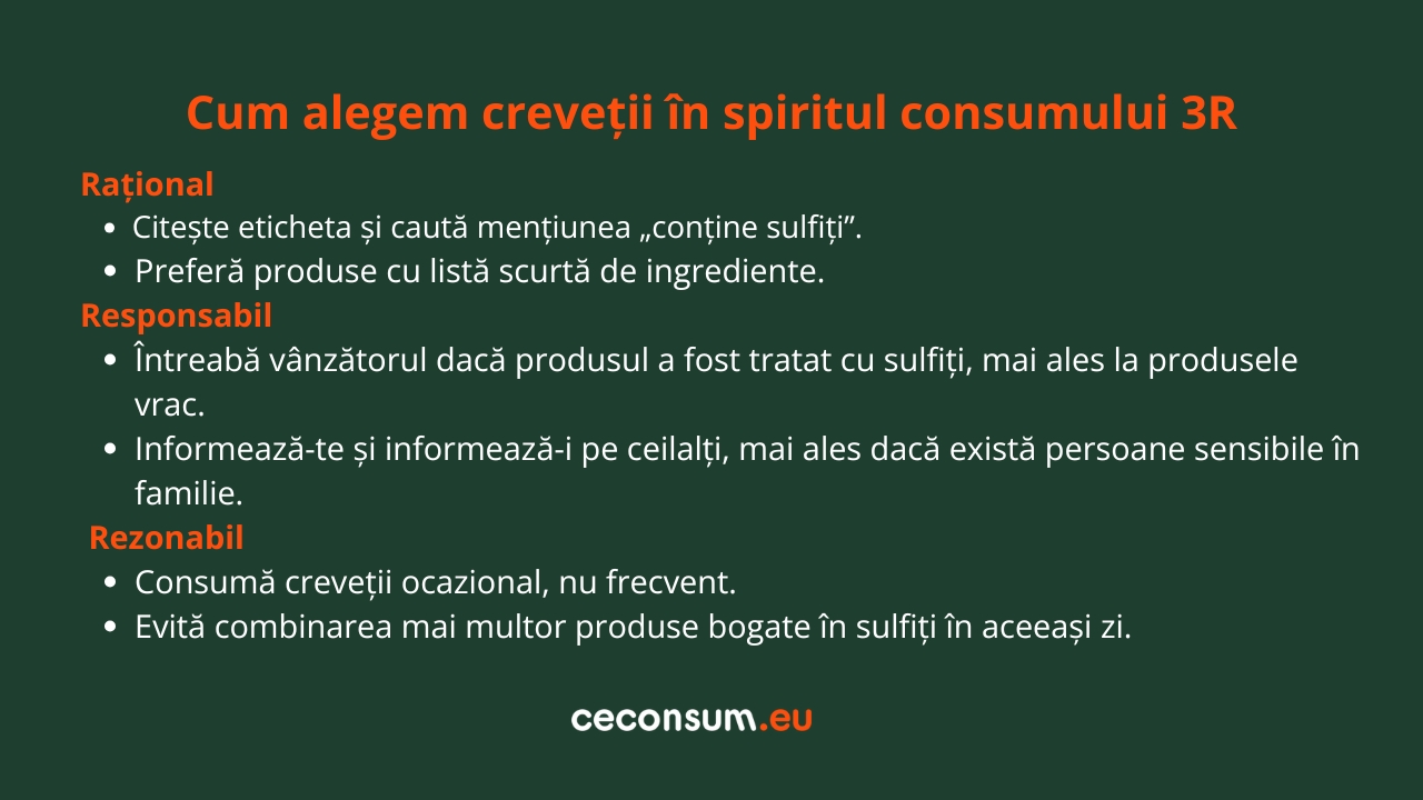 Pe platforma CE CONSUM EU analizăm din perspectiva siguranței alimentare ce sunt sulfiții, de ce sunt utilizați în creveți, ce efecte pot avea asupra sănătății și cum poate consumatorul face alegeri informate, în spiritul consumului rațional, responsabil și rezonabil (3R).