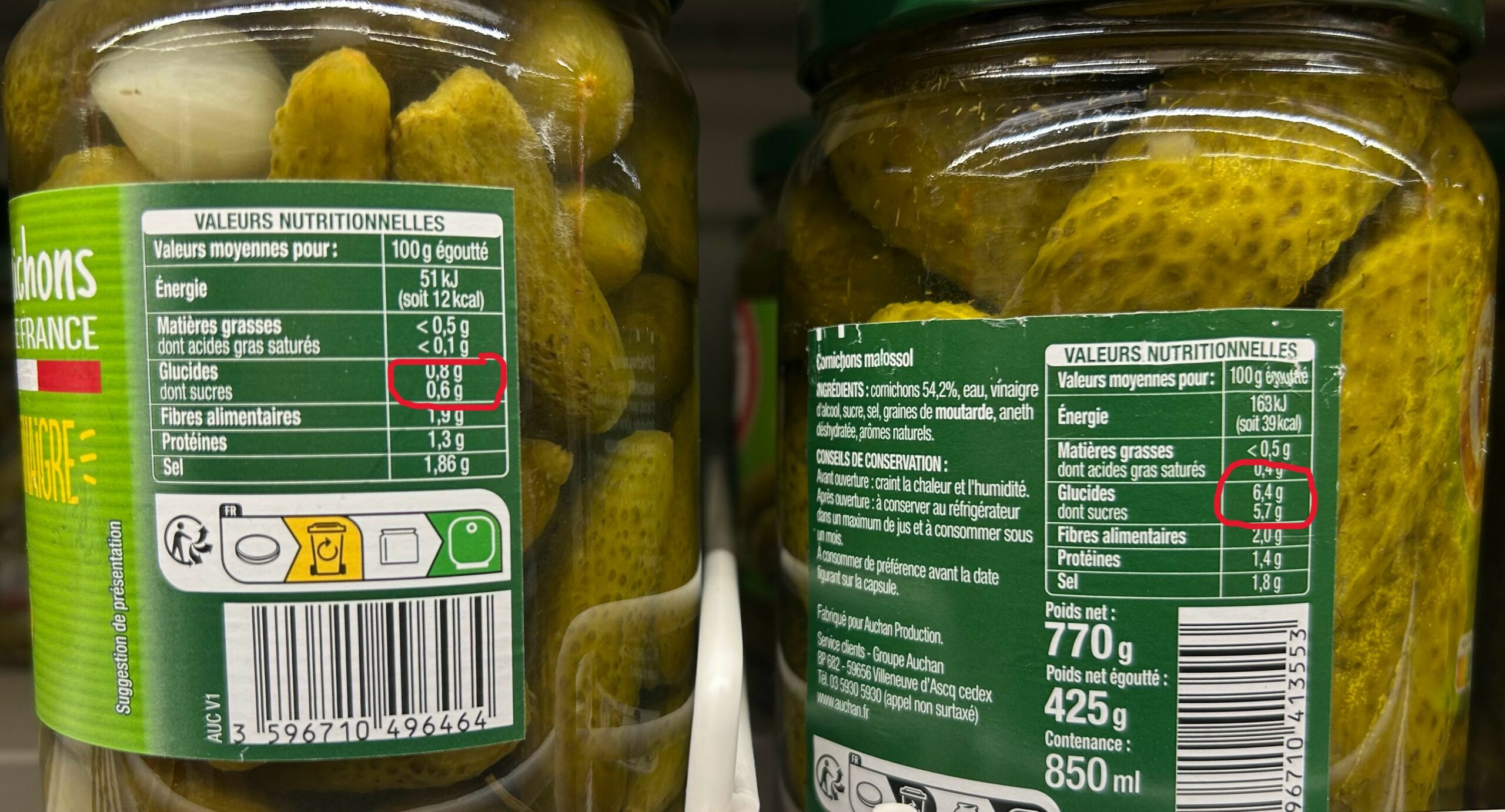 Am comparat două produse de același tip – castraveți murați – găsite pe același raft la un supermarket din Franța. Pe hârtie, ambele par identice. În realitate, diferențele sunt mari: